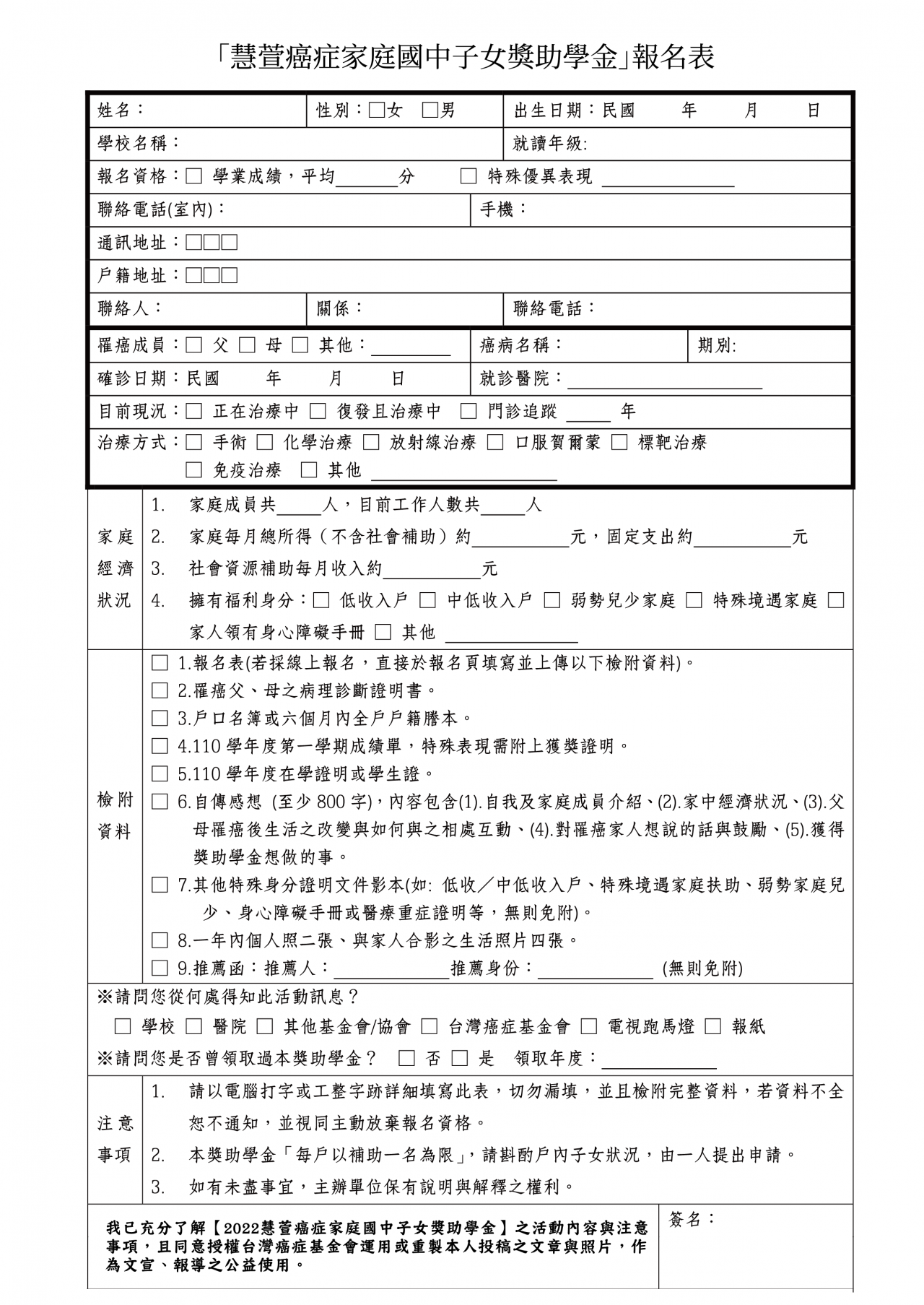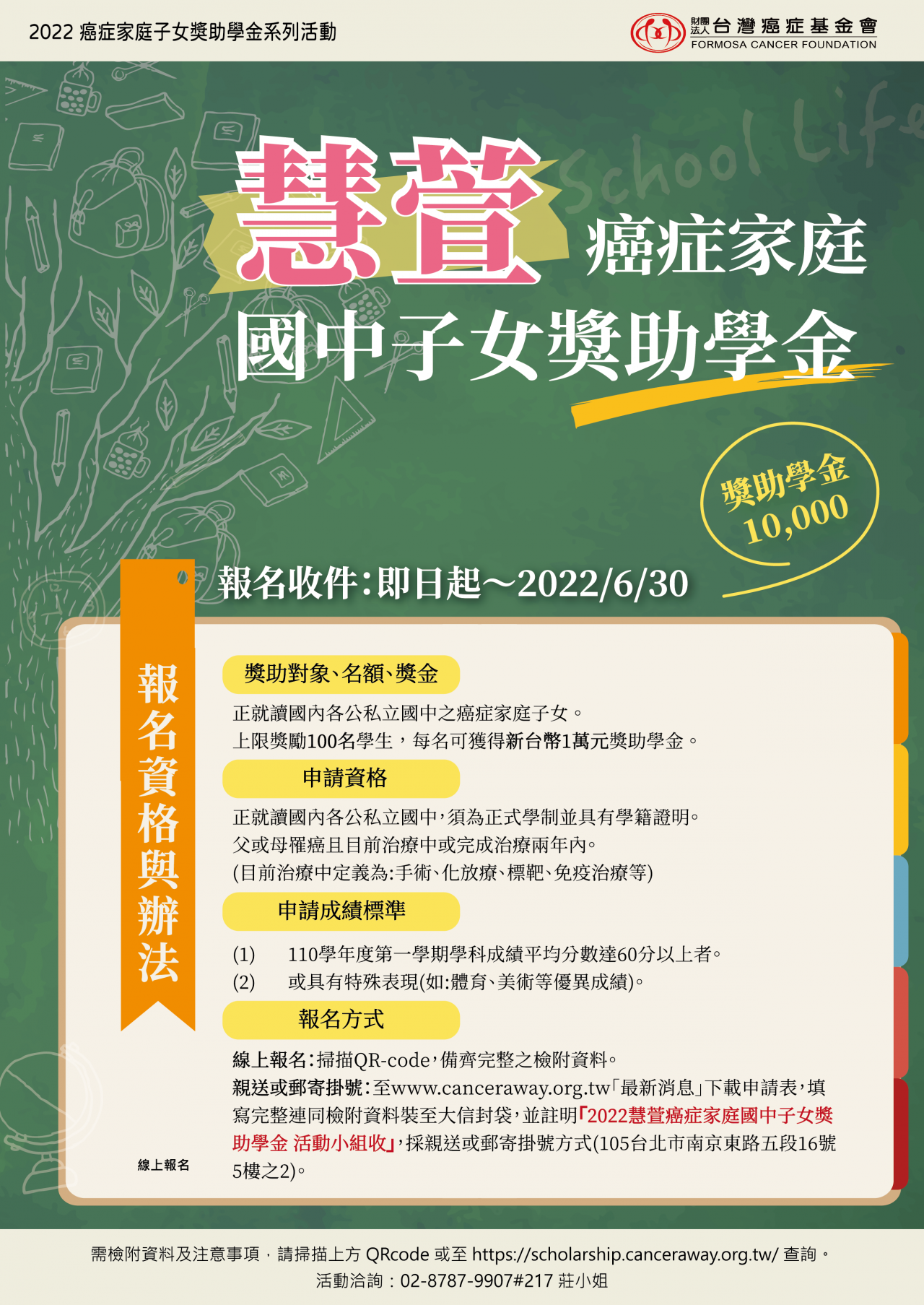 (四)報名方式(下列擇一) 1、線上報名: https://scholarship.canceraway.org. tw/ 2、掛號郵寄:至台灣癌症基金會官網「最新消息」下載 申請表,填寫完成後連同檢附資料寄至 105 台北市南京 東路五段 16 號 5 樓之 2 ,並註明「2022 慧萱癌症家庭國 中子女獎助學金 活動小組收」。 3、洽詢電話:(02)8787-9907 分機 217 莊小姐。