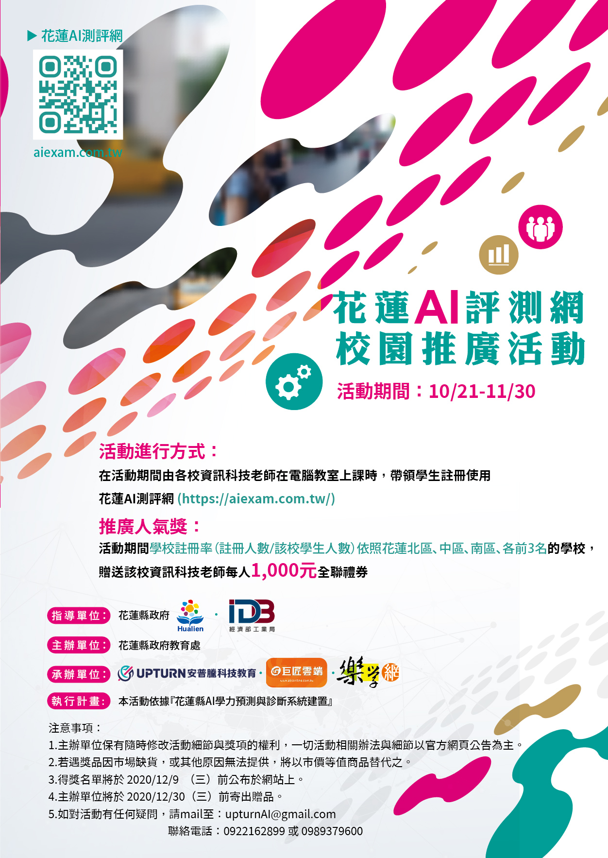 | 主旨: | 函轉安普騰科技「花蓮 AI 評測網」校園推廣活動海報一份,惠請鼓勵貴校學生踴躍註冊參與,請查照。 |